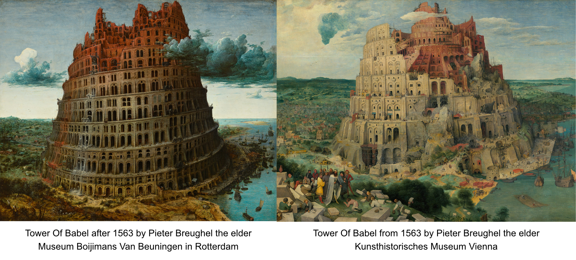 There are a lot of websites about the Palestinians and the Israelis. Most of them are driven by politics, politicization and even religionization. which threatens the visitor's attention away from that what should be all about: how did they all got into a situation that never seems to end. It is at least obvious that most of them av History is often explained as "umbrella term". That is confusing because it is the presentation of a totality as a whole, so encompassing everything that belongs to that totality. If you want everything that belongs to the totality in an arrangement, laying out the exact order in which everything became to exist, you need to speak in terms of chronology, whereby politics, politicization and even religionization are irrelevant. "Everything" means here any link belonging to an endless chain. And, every link belongs to one other, is part of one other and is associated to one other even when a link is related to a link ahead of it or way back from it. Because, that particular link can't exist if it is not 'sprouted' from a previous link who also needs to 'sprout' from another link. Each link presents or represents an event, a happening, an occurrence. In first instance, they look different from each other as they may be about different issues in different situations like one is about religion while the next one is about war. But, how do they in first become to look different? There's an religious answer in sense of a story that the Flemish Golden Age painter Pieter Breughel the elder visualized in two versions. One version is to see in Rotterdam, Netherlands. The other version is in Vienna, Austria.