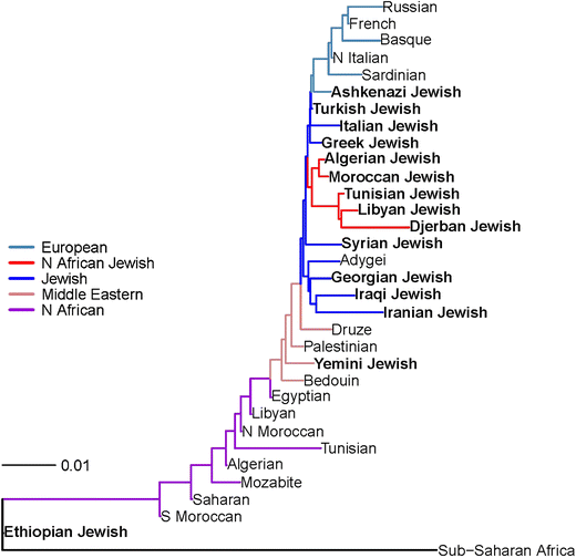 So, how do you define the roots of an ethnic group when using (medical) scientific methods such as generic profiling? To to do such profiling, you need samples of the very first people to match them with samples of today's people, not the samples of people from a cherry picked (Canaan) era or samples from a cherry picked (Jewish) group of people like the diagram below is showing. The diagram looks very identical to diagrams about the distribution of the first humans, starting from the region of what is now Uganda and Kenya, then into north, crossing the discussed region into what is now Turkey, and from there into and across Europe and to Asia. Is the unknown source trying to tell that the roots of the Jewish is anywhere in the sub-Saharan region, Ethiopia for example?